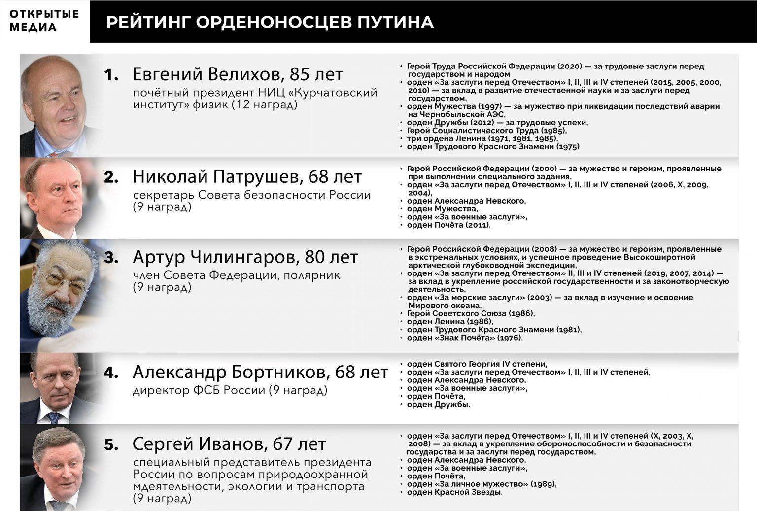 Возглавляет рейтинг физик и почётный президент «Курчатовского института» Евгений Велихов с 12 высшими наградами, 6 из них получены при Путине, включая последнюю — звание «Герой Труда России», присвоенное в начале 2020 года. При этом у Велихова есть и звание «Герой Социалистического Труда». Далее идут сразу 6 человек с 9 наградами. Среди них полярник и депутат Госдумы Артур Чилингаров («Герой России» и «Герой Советского Союза» за достижения в Арктике и Антарктике), политический старожил Владимир Ресин и кадровый сотрудник спецслужб, а ныне заместитель министра иностранных дел Олег Сыромолотов. Ещё три человека — креатуры Путина: секретарь Совета Безопасности Николай Патрушев, директор ФСБ Александр Бортников и Сергей Иванов, специальный полпред президента. Все трое — полные кавалеры ордена «За заслуги перед Отечеством». Близость к Путину или его окружению прослеживается даже среди награждённых в науке и образовании. Всего в рейтинге пять человек, связанных с наукой — Велихов, два бывших президента Российской академии наук (Юрий Осипов и Владимир Фортов), а также Иван Дедов и Виктор Садовничий. Дедов — президент Национального медицинского исследовательского центра эндокринологии. Здесь работает детским эндокринологом Мария Воронцова, которую СМИ называют дочерью Путина. Дедов был научным руководителем Воронцовой. У компании «Иннопрактика» Катерины Тихоновой, которую СМИ также считают дочерью Путина — совместные проекты с МГУ, возглавляемым Садовничим. В декабре 2019 года Садовничий был переназначен ректором МГУ на следующие пять лет по указу президента России, тогда же в структуре вуза появился институт искусственного интеллекта, который, по информации «Ведомостей», возглавила Катерина Тихонова. Коллекционер-фалерист указывает, что проблема современной российской наградной системы не только в поощрении людей, близких к высшему лицу государства — так было во все времена, но и в самой процедуре награждения: люди получают ордена не за конкретные заслуги, а к юбилейной дате. «Ордена опустили до уровня подарка на день рождения», — объясняет он. Например, министр иностранных дел Сергей Лавров, родившийся в 1950 году, последние награды получал к своим юбилеям: в 2005, 2010, 2015 и 2020. Валентина Матвиенко получила высший государственный орден — Святого апостола Андрея Первозванного — на 70-летие, а ордена «За заслуги перед Отечеством» I и II степеней — на 65- и 60-летие. «Обилие вручённых наград их обесценивает: они девальвировались ещё при Брежневе, превратившем награды в опереточные. В этом смысле брежневская эпоха продолжается. Что эксклюзивного можно подарить на юбилей человеку, у которого все есть — такому как Ротенберг? Можно ящик эксклюзивного вина, а можно награду, оформленную указом президента. Путин, как все жесткие люди, человек сентиментальный — он наград не жалеет, так он демонстрирует своё уважение человеку», — считает политолог Станислав Белковский. Особо показательна ситуация с юбилеями деятелей культуры и искусства. Например, певец Лев Лещенко, родившийся в 1942 году, стал полным кавалером ордена «За заслуги перед Отечеством», получая награды с лагом в 5 лет — в 2002, 2007, 2012 и 2017 годах; худрук Малого театра Юрий Соломин, 1935 года рождения, награждён орденом «За заслуги перед Отечеством» I и II степеней (2015 и 2005), орденом Почёт