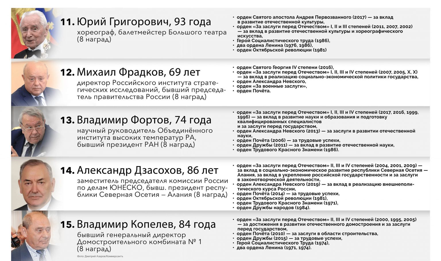 Что у нас получилось? В рейтинг вошли 50 человек, у каждого из которых минимум 6 главных наград — высших званий и/или орденов. Почти половина участников (23) политики или люди, оказывающие влияние на политическую обстановку в стране. В эту категорию, в частности, включены глава «Ростеха» Сергей Чемезов и патриарх Кирилл. Девять человек — из сферы культуры и искусства, пять — науки и образования, еще пятеро — силовики, трое — бизнесмены, трое — спортивные функционеры. Средний возраст участника рейтинга орденоносцев — 75 лет, самому молодому — 56 лет (заместитель министра обороны и бывший глава республики Ингушетия Юнус-Бек Евкуров), самому опытному — 93 года (хореограф Юрий Григорович). В списке всего три женщины: председатель Совета Федерации Валентина Матвиенко, президент Федерации художественной гимнастики Ирина Винер-Усманова и президент МХАТ имени Горького Татьяна Доронина.