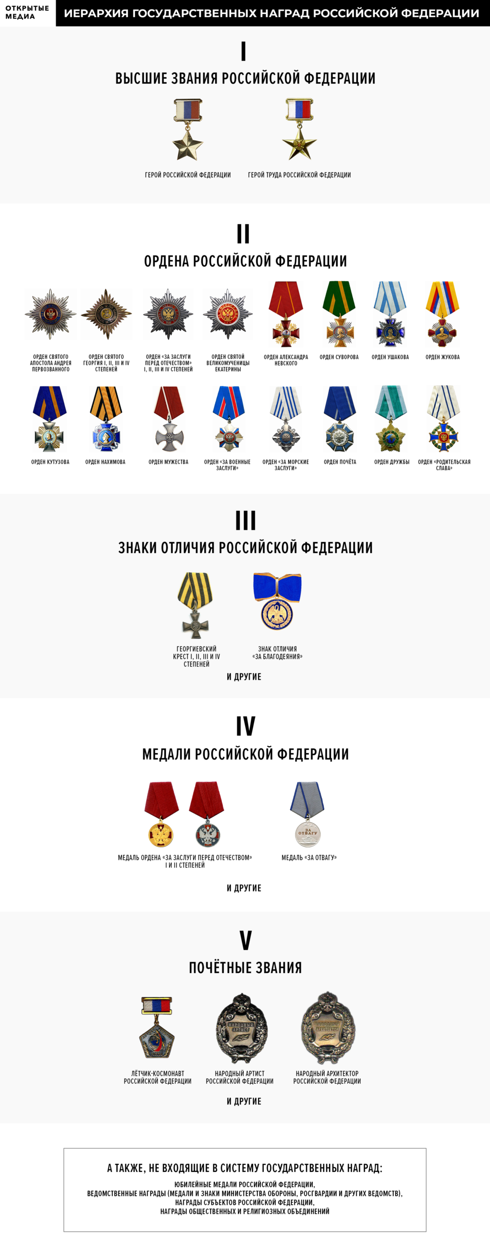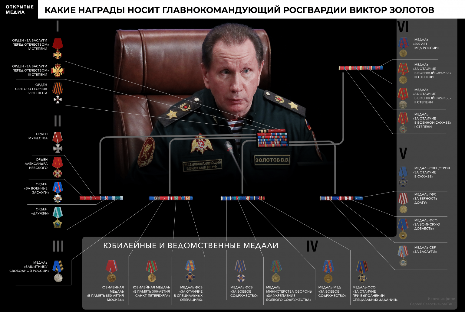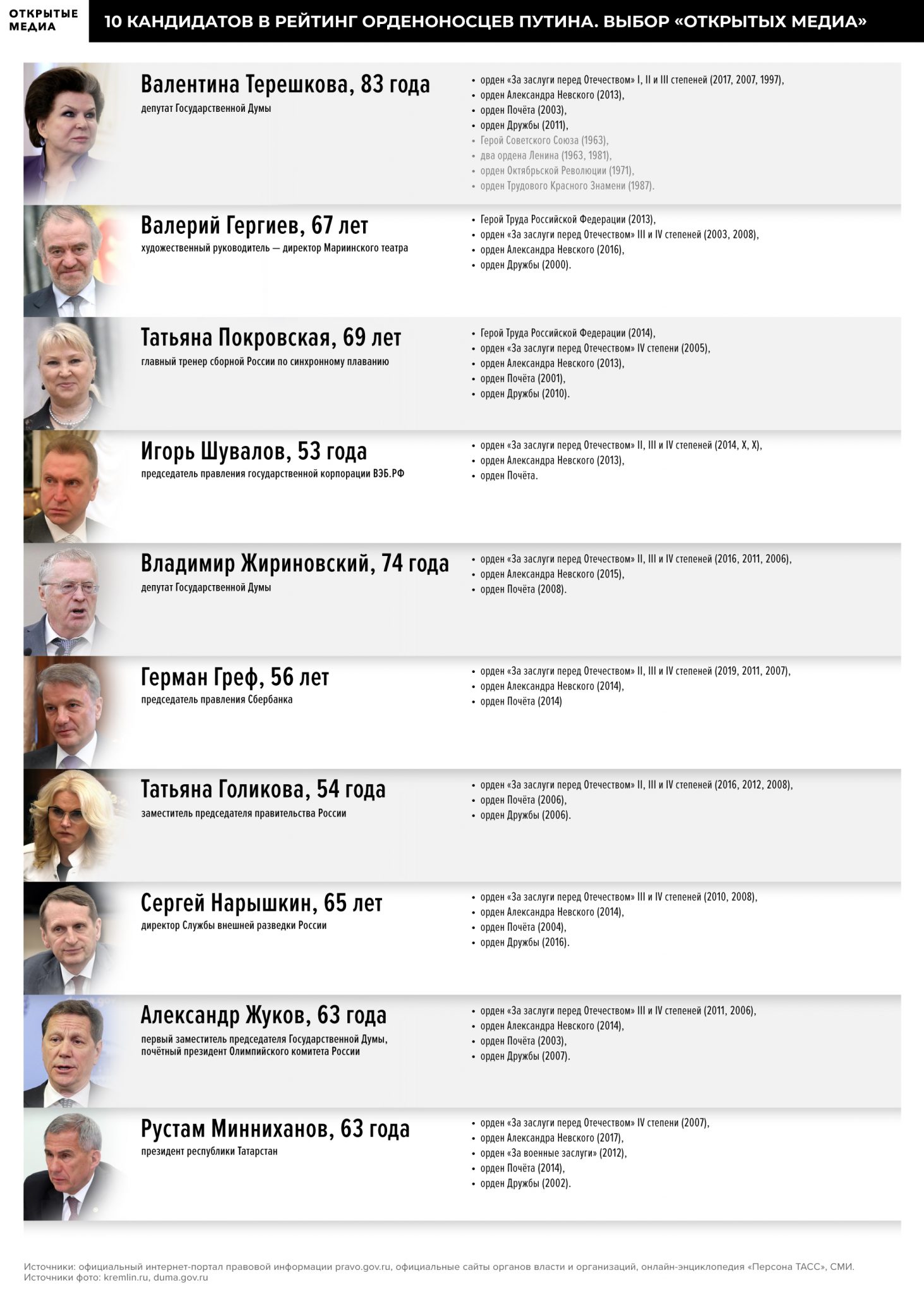 Рейтинг орденоносцев Путина И Шойгу, и Золотов носят ведомственные награды. У Шойгу это «свои», медали от министерства обороны — «За укрепление боевого содружества», «200 лет министерству обороны» и «За возвращение Крыма». У Золотова есть ведомственные медали ФСО, ФСБ, МВД, СВР, Спецстроя и даже Государственной фельдъегерской службы. Но, конечно, главными для них являются государственные награды. У Шойгу это звание «Героя России» и высший государственный орден Святого апостола Андрея Первозванного, у Золотова — высший военный орден Святого Георгия IV степени, а также орден Мужества. По количеству орденов оба руководителя силовых ведомств входят в число самых награждённых чиновников путинской эпохи, хотя и не попадают в первую десятку орденоносцев. С целью понять, кто и как получает высшие государственные награды в современной России, «Открытые медиа» составили рейтинг орденоносцев. При этом мы руководствовались тремя основными принципами. Во-первых, мы отказались от идеи учитывать в рейтинге только ордена и высшие звания, полученные при президентах Путине и Медведеве, так как многие из заслуженных россиян часть своих наград получали при президенте Борисе Ельцине и даже во времена СССР. Поэтому в рейтинг мы включили тех обладателей высших государственных званий и орденов, у кого не менее половины наград получено по указам Путина и Медведева. Во-вторых, участников рейтинга мы ранжировали по числу наград, причём при равном их количестве приоритет отдавался наградам, стоящим выше в государственной наградной системе страны. В-третьих, мы учли, что военными наградами прежде всего поощряются кадровые военные и другие силовики, зачастую непубличные люди, причём значительная часть этих наград присваивается секретно, из-за чего достоверно ранжировать их получателей невозможно. Поэтому из профессиональных военных и спецслужбистов мы включили в рейтинг только руководителей силовых ведомств.