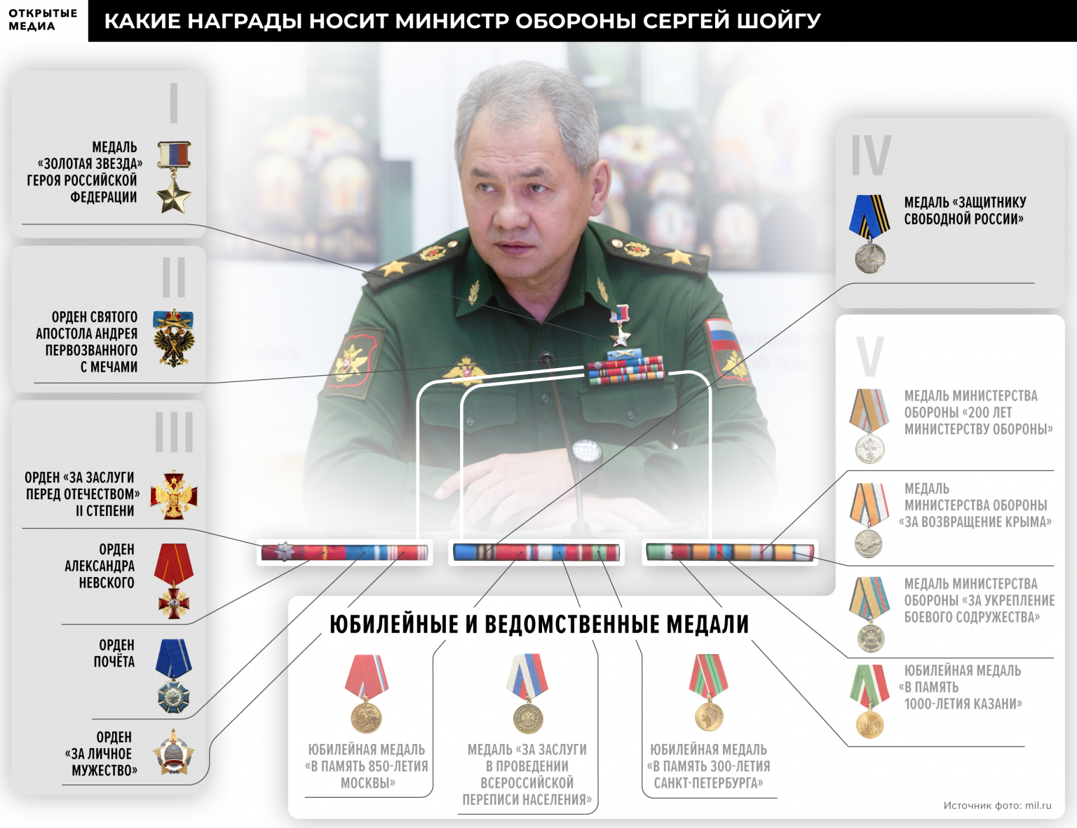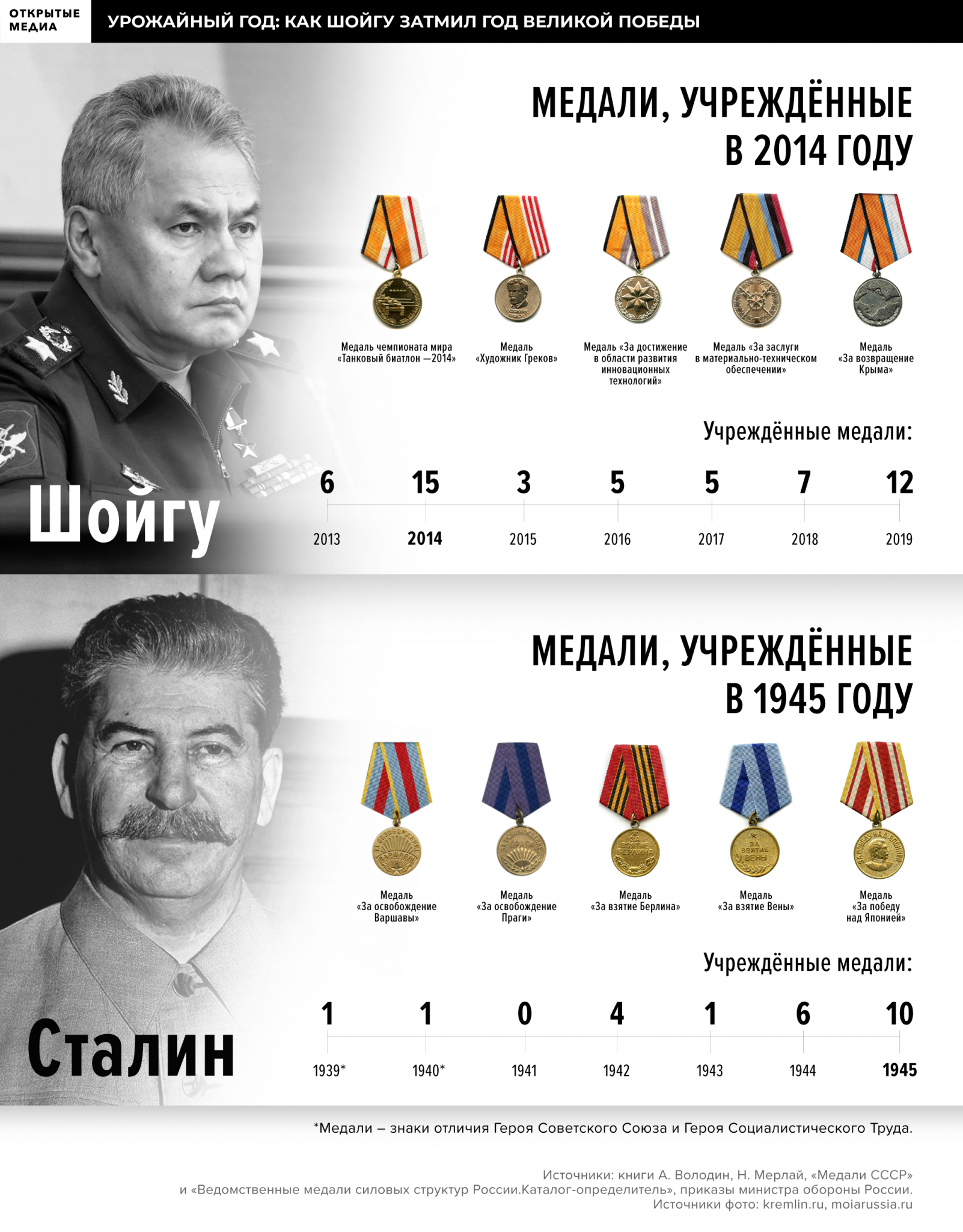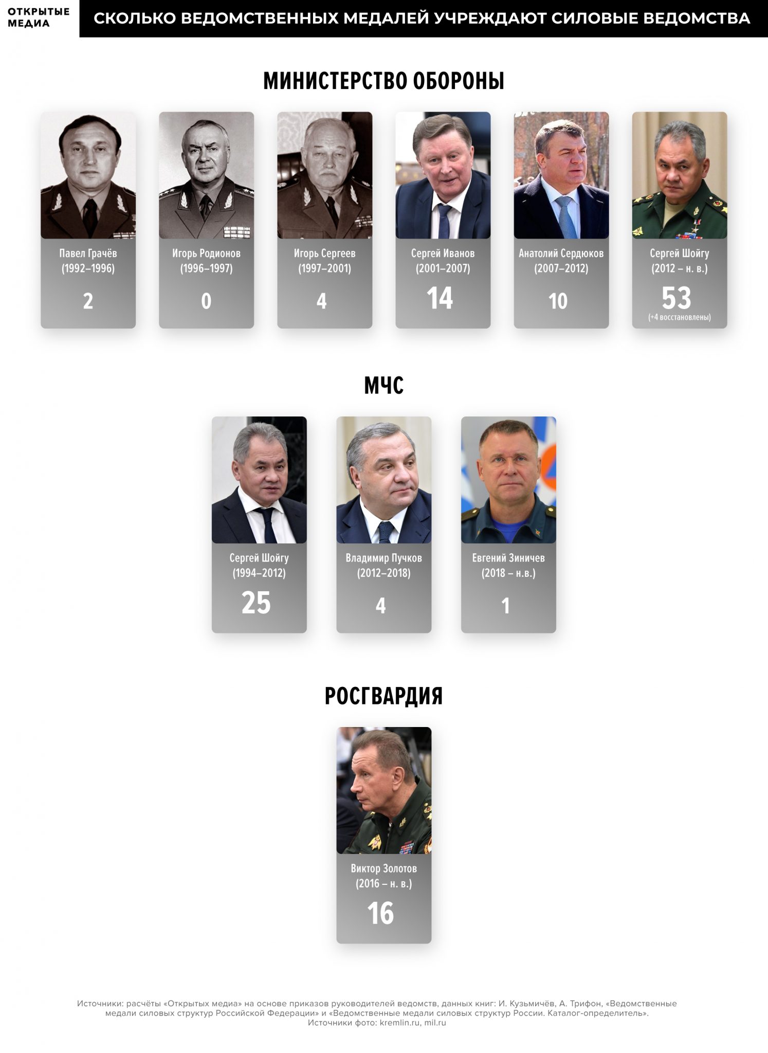 Но кроме государственной системы наград, в которой наведён хоть какой-то порядок, существуют и другие наградные системы. Во-первых, есть юбилейные медали — например «70 лет Победы в Великой Отечественной войне 1941−1945 гг.» или «В память 300-летия Санкт-Петербурга». Во-вторых, собственные награды есть у общественных и религиозных организаций — Русская православная церковь учредила 23 ордена и медали, включая свою версию ордена Святого апостола Андрея Первозванного. И в-третьих, федеральные ведомства и российские регионы выпускают ордена и медали, и никто не мешает отдельному органу власти наштамповать наград на все случаи жизни — например, по числу медалей министерство обороны далеко обгоняет государство. Медали Шойгу К началу 2000 года министерство обороны обходилось всего тремя ведомственными медалями: «За укрепление боевого содружества», «За отличие в военной службе» и «За воинскую доблесть». У ещё одной военизированной структуры — МЧС — было две медали «За отличие в военной службе» и «За безупречную службу». Всё изменилось после прихода близкого знакомого Владимира Путина и кадрового разведчика Сергея Иванова на должность министра обороны. В 2002 году ведомство учредило 2 новые медали, в 2003 — 4, в 2004 — 2, в 2005 и 2006 — по 3. Среди них, в частности, появились медали «200 лет министерству обороны» и «300 лет Балтийскому флоту», а медаль «Генерал-майор Александр Александров» вручается за «вклад в создание и популяризацию военно-патриотической музыки России и развитие армейской музыкальной культуры». При следующем гражданском министре Анатолии Сердюкове, которого невзлюбили кадровые военные, темп создания новых ведомственных наград немного снизился. К тому же он отменил сразу 4 медали, учреждённые при Иванове. Но параллельно запустился маховик по выпуску новых медалей в другом ведомстве — МЧС. И если в министерстве обороны менялись руководители и их отношение к наградам, то у МЧС — несменяемый начальник Сергей Шойгу придерживался одного курса. В 2005 году появляется сразу 5 новых медалей, в числе которых «За пропаганду спасательного дела». Коллекционер-фалерист, пообщавшийся с «Открытыми медиа» на условиях анонимности, шутя называют эту медаль показательной, ведь МЧС всегда делало на PR не меньшую ставку, чем на конкретные дела. На «ивановскую» медаль «200 лет министерству обороны» МЧС отвечает своими наградами: сначала появляется медаль «XV лет МЧС России», затем «XX лет МЧС России» и, наконец, «XXV лет МЧС России». Министерство, кажется, не могло пропустить ни одной памятной даты — учреждаются медали «75 лет гражданской обороны», «200 лет профессиональной пожарной охране Москвы» и даже «50 лет журналу «Гражданская защита». В 2012 году Шойгу, меняет одно силовое ведомство на другое: побыв после ухода с поста главы МЧС несколько месяцев губернатором Московской области, он становится министром обороны. На тот момент у ведомств наградной паритет — у министерства обороны 26 наград, у МЧС — 25. Но ситуация меняется уже на следующий год — новый министр обороны за год учреждает 6 медалей (среди них «За усердие в обеспечении безопасности дорожного движения») и возвращает 4 отменённые при Сердюкове медали. 2014 год и вовсе становится рекордным: у министерства обороны появляются 15 новых медалей. «Урожайный год» Шойгу превосходит даже победный 1945 год, к
