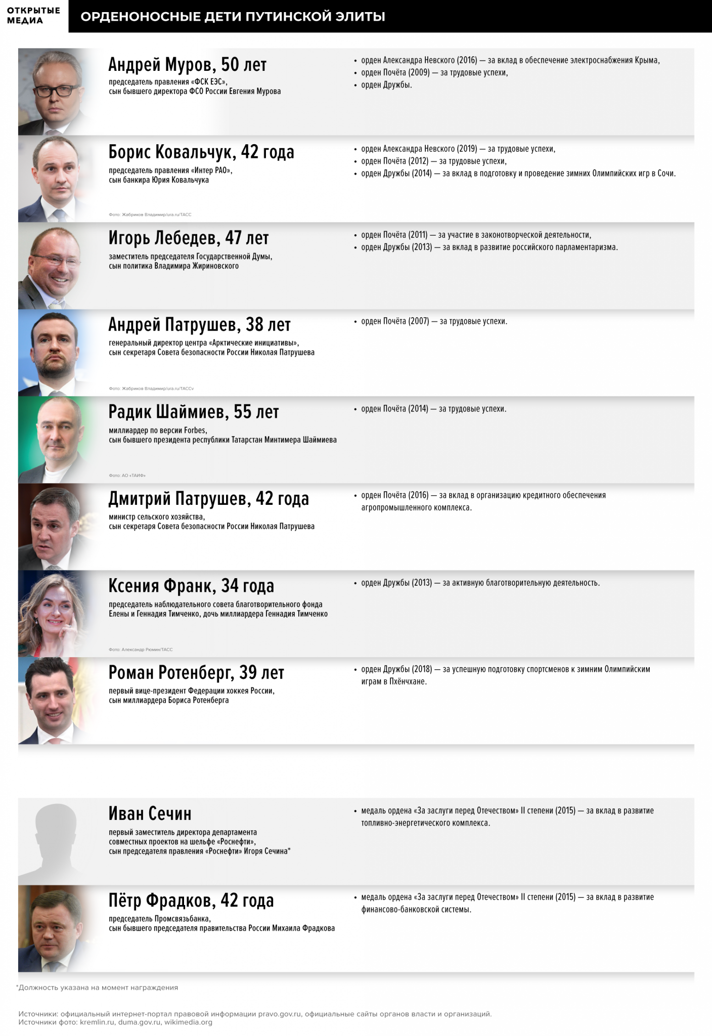 Друг Путина, виолончелист и акционер банка «Россия» Сергей Ролдугин награждён дважды — у него есть орден Почёта за вклад в музыкальное искусство и орден Александра Невского за участие в концерте в Пальмире в 2016 году. Награды получают не только люди из ближнего окружения Путина, но и их родственники. Например, у миллиардера Геннадия Тимченко, которого «Минченко консалтинг» называет участником «Политбюро 2.0», вовсе нет российских государственных наград (по официальным документам, конечно). Зато его супруга награждена орденом Дружбы за активную благотворительную деятельность. У жены Сергея Чемезова — Екатерины Игнатовой — медаль ордена «За заслуги перед Отечеством» II степени за вклад в развитие проекта «Единая модульная платформа» (лимузины Aurus), сестра министра обороны и депутат Государственной думы Лариса Шойгу награждена орденом Дружбы за вклад в развитие российского парламентаризма. Виктор Патрушев, брат секретаря Совета безопасности Николая Патрушева, получил ордена Почёта и Дружбы за трудовые успехи. Сыновья Николая Патрушева также награждены орденами. Дмитрий Патрушев, министр сельского хозяйства — орденом Почёта за работу на должности председателя правления Россельхозбанка; Андрей Патрушев — на тот момент советник председателя совета директоров «Роснефти» Игоря Сечина — орденом Почёта за трудовые успехи. Но куда больше наград у детей путинской элиты, работающих в электроэнергетике. Андрей Муров, сын бывшего директора ФСО Евгения Мурова, и Борис Ковальчук, сын банкира Юрия Ковальчука, уже получили по три ордена — Александра Невского, Почёта и Дружбы. Муров-младший возглавляет государственную компанию «ФСК ЕЭС», управляющую магистральными электрическими сетями. Ковальчук-младший — председатель правления государственного холдинга «Интер РАО», который производит и экспортирует электроэнергию.