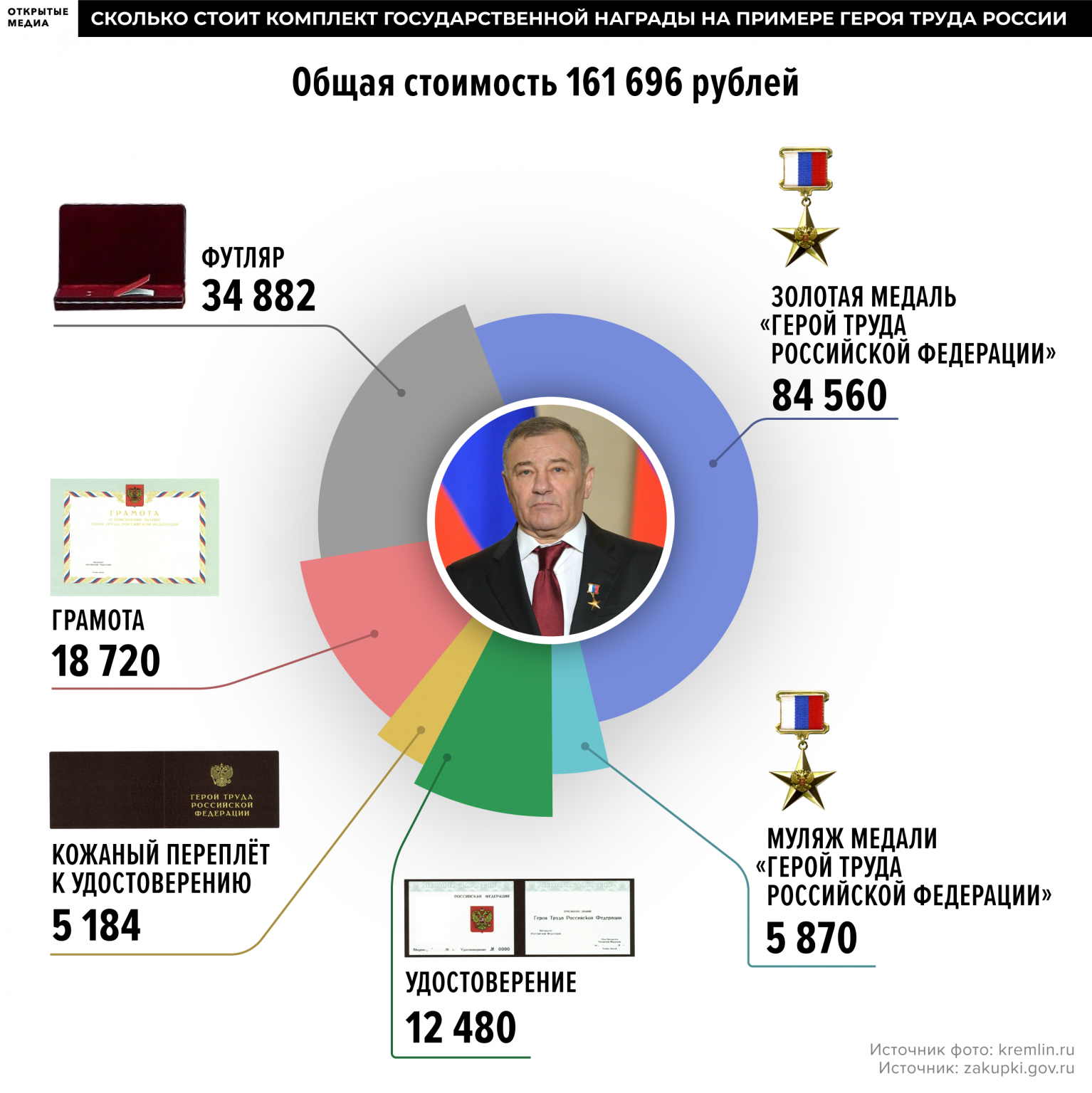 Правда, надо учитывать, что стоимость награды для государства не ограничивается только ценой изготавливаемого ордена или медали. Например, лицу, которому присвоено высшее звание «Герой Труда России», вручается не только золотая медаль (вес — 15,25 грамма золота) стоимостью 84,6 тысячи рублей, но и муляж медали за почти 6 тысяч рублей, удостоверение за 12,5 тысячи рублей, кожаный футляр за 34,5 тысячи рублей и другие предметы. Общая цена наградного комплекта почти в два раза больше — 162 тысячи рублей.