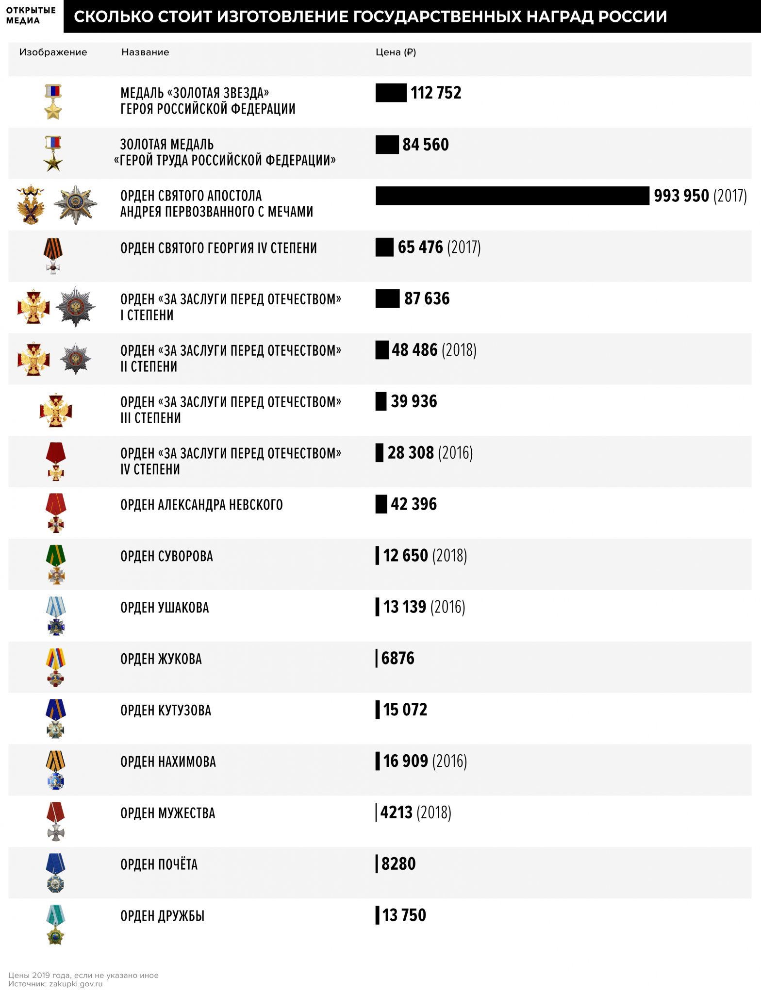 Деньги, льготы и бюсты Что даёт награждаемому орден? Это, прежде всего, нематериальная награда, считает коллекционер-фалерист, для элиты — сигнал, знак внимания первого лица государства. Тем не менее, у каждого ордена есть своя цена. Управление делами президента России (УДП) ежегодно заказывает награды и сопутствующую продукцию на десятки миллионов рублей. Стоимость закупок меняется от года к году в зависимости от количества приобретаемых орденов, так как УДП, как правило, покупает награды с запасом. По данным портала госзакупок, в 2019 году УДП потратило более 49 млн рублей на ордена, медали и полиграфическую продукцию, в 2018 — почти 54 млн рублей. Сопоставимые суммы тратит на награды и министерство обороны: в 2019 году — более 65 млн рублей, а в 2018 — и вовсе 146,5 млн рублей, из них 77 млн — на изготовление 340 тысяч удостоверений и медалей «Участнику манёвров войск (сил) «Восток-2018». Если военное ведомство заказывает свои медали десятками или даже сотнями тысяч, то государственные награды, закупаемые УДП, всё-таки штучный товар. Есть разница и в поставщиках. Для министерства обороны награды производят небольшие частные компании вроде завода «Мосштамп» и фирмы «Атлантик», а по заказам УДП работают подведомственные ему ФГУПы «Русские ремёсла» и «Издательство «Известия», а также «Гознак». Самая дорогая награда в изготовлении — орден Святого апостола Андрея Первозванного. В 2017 году УДП заказало версию ордена с мечами для награждения за отличия в боевых действиях, за 993 950 рублей. Орден имеет знак (выполняется из золота и серебра), звезду (серебро), орденскую цепь (серебро с позолотой с использованием горячих эмалей) и орденскую ленту (шёлк). Стоимость других государственных орденов в разы ниже. Например, орден Святого Георгия IV степени в том же 2017 году обошёлся УДП в 65 тысяч рублей. А самая почитаемая среди сотрудников силовых ведомств награда — орден Мужества, вручаемая за самоотверженность, мужество и отвагу, — и вовсе стоит чуть более 4 тысяч рублей.