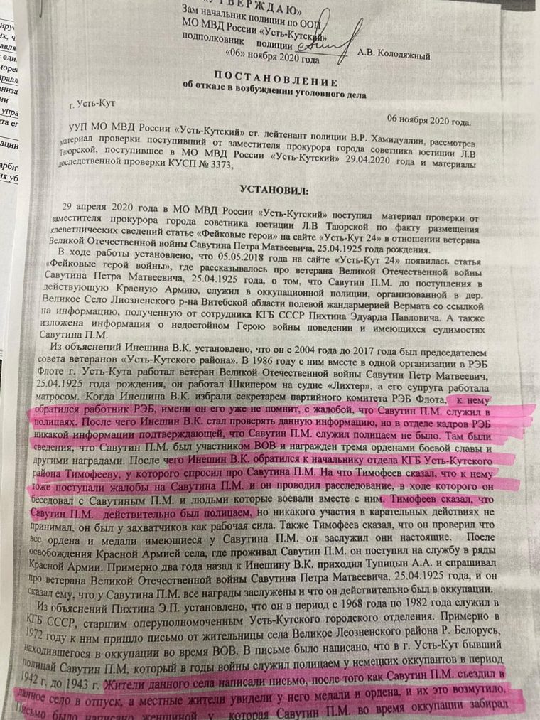 «… Мы им занимались с 1983 года по 1988, показания о службе Петра Савутина в полиции на оккупированных территориях дали многие его односельчане и в том числе родной брат Савутина. Нам к сожалению не удалось разговорить его и во всем признаться, но если бы еще немного времени, то все доказательства мы бы собрали. К тому же руководитель района Иван Алексеевич Панчуков был против продолжения расследования, потому-что считал. что оно дискредитирует честных ветеранов войны….»